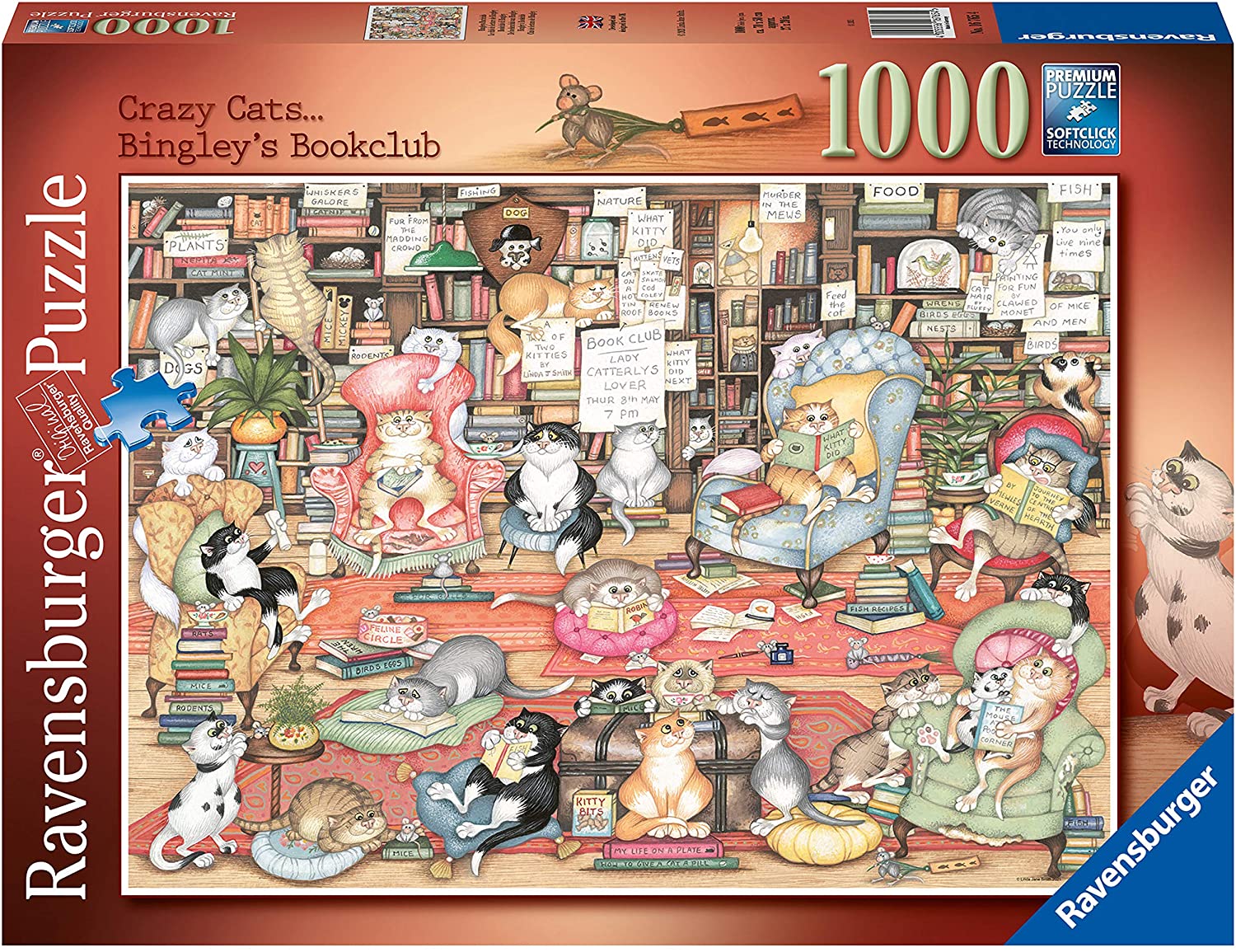 SKU RAV16765 Manufacturer Ravensburger Availability 2 in stock Crazy Cats Bingley's Bookclub (Jigsaw 1000pc) Crazy Cats Bingley's Bookclub (Jigsaw 1000pc) Old price: £14.99 incl tax Price: £11.99 incl tax Qty: Add to cart Email a friend Question about product? Add to wishlist Details Linda Jane Smith’s Crazy Cats gather to investigate, share and discuss their favourite books at Bingley's Book club. What Kitty Did, The Mouse at Pooh Corner and Journey to the Centre of the Hearth are amongst the titles being reviewed, and there are more interesting and unusual titles on the crowded shelves. The meeting on the 8th May is not to be missed; the kitties will discuss Lady Catterly’s Lover! Follow the lead of these marvellous moggies and wind down from daily pressures and create some mindful moments as you build this amusing and absorbing jigsaw puzzle; #positively puzzling. A great gift idea for cat lovers aged 12 years +. Our 1000 piece jigsaws are crafted with premium quality materials and measure 69 x 49cm when complete. About the artist - Creator of our Crazy Cats range, Linda loves hunting for "old stuff" at car boot and jumble sales. When painting our scenes she delights in showing that an item has been "loved" and says that a spot of rust never hurt anyone!