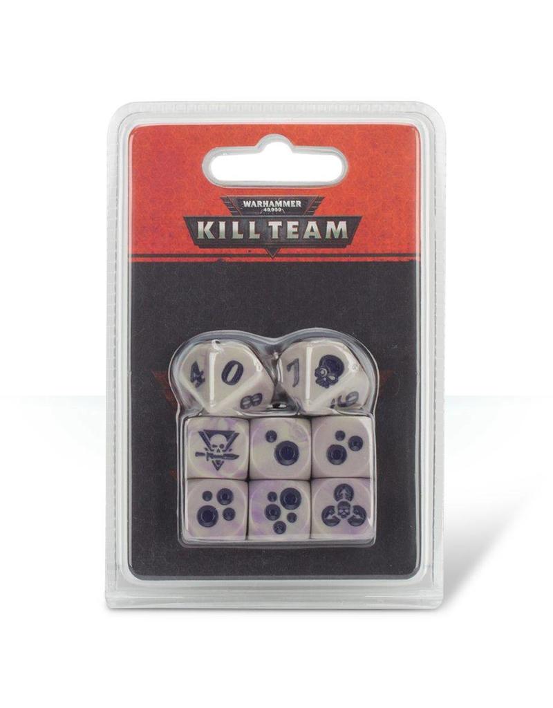 This set contains 6 6-sided dice and 2 10-sided dice – the former used during games of Kill Team, the latter used to roll on certain tables when assembling your squad ready for combat. Themed to represent the Gellerpox Infected, these dice are swirled purple and off-white, with purple markings. The D6 feature an icon of Nurgle in place of the 6 and a Kill Team logo in place of the 1; the D10 feature a skull in place of the 1.
