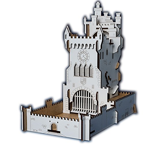 The mechanical dice tower White Castle provides honest and neat rolls of any kind of dice. The lever-turret not only throws dice inside the tower but also activates the movable elements on the front side: in the lancet windows and at the roof of the Castle the residents and defenders appear and the portcullis goes in up position.