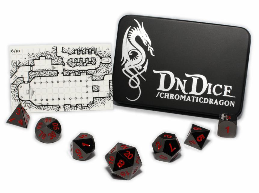 Unlike regular dice, this metal set is die cast in zinc and electroplated in a dark chrome with red inking which provides perfect readability from the other side of the gaming table.