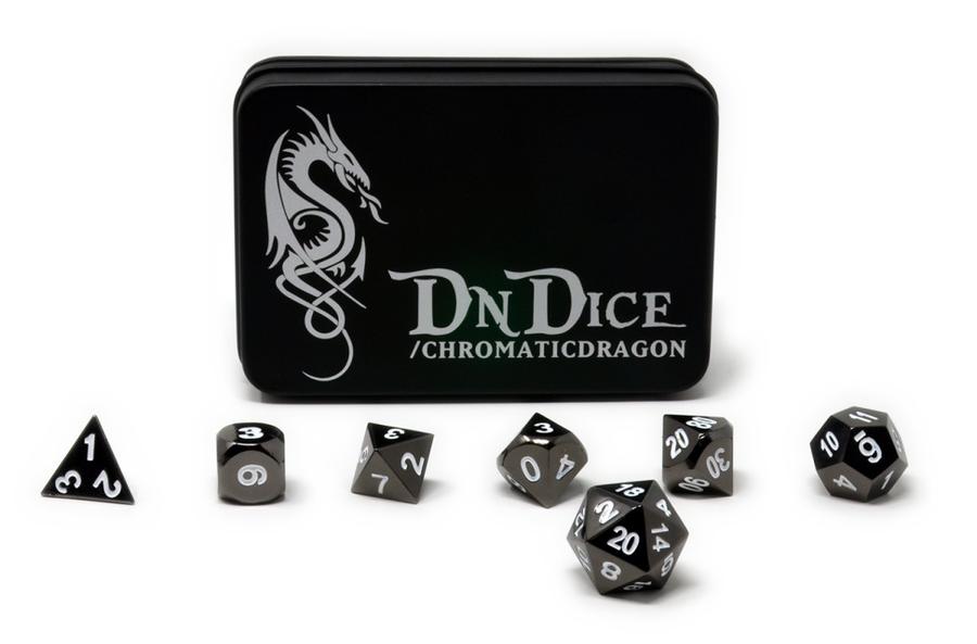 Vampires driving you batty? A full solid metal set of 7 poly dice coated in a dastardly dark chrome with white inking is here is here to help vanquish evil! Each set comes with a d20, d12, d10, d8, d6, d4 and a percentile die complete with a black metal carry tin.