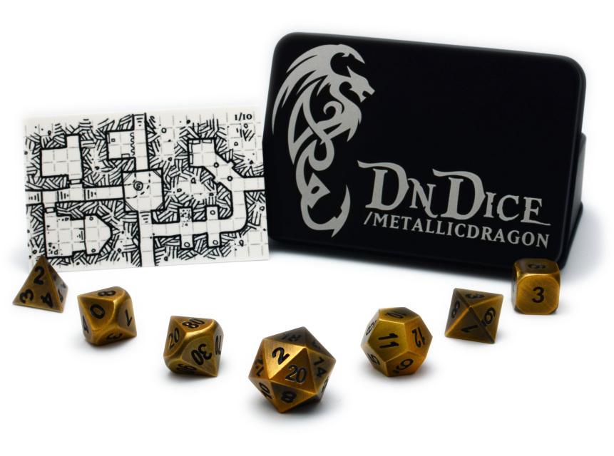 Beholders eyeing you up? A full Metal set of 7 poly dice coated in a brushed gold finish is here to help vanquish evil! Each set comes with a d20, d12, d10, d8, d6, d4 and a percentile die complete with a black metal carry tin.