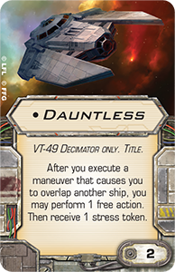SKU SWXTI06 Availability 7 in stock Dauntless (X-Wing 1.0) Dauntless Old price: £20.17 incl tax Price: £0.54 incl tax Qty: Add to cart Email a friend Question about product? Add to wishlist Details VT-49 DECIMATOR ONLY. TITLE. After you execute a maneuver that causes you to overlap another ship, you may perform one free action. Then receive 1 stress token. Points:2 Customers who bought this item also bought Evade Token(X-Wing 1.0) £0.05 incl tax Focus Token(X-Wing 1.0) £0.05 incl tax Stress Token(X-Wing 1.0) £0.05 incl tax Shield Token(X-Wing 1.0) £0.05 incl tax Ion Token(X-Wing 1.0) £0.05 incl tax Countermeasures (X-Wing 1.0) £0.29 incl tax < >