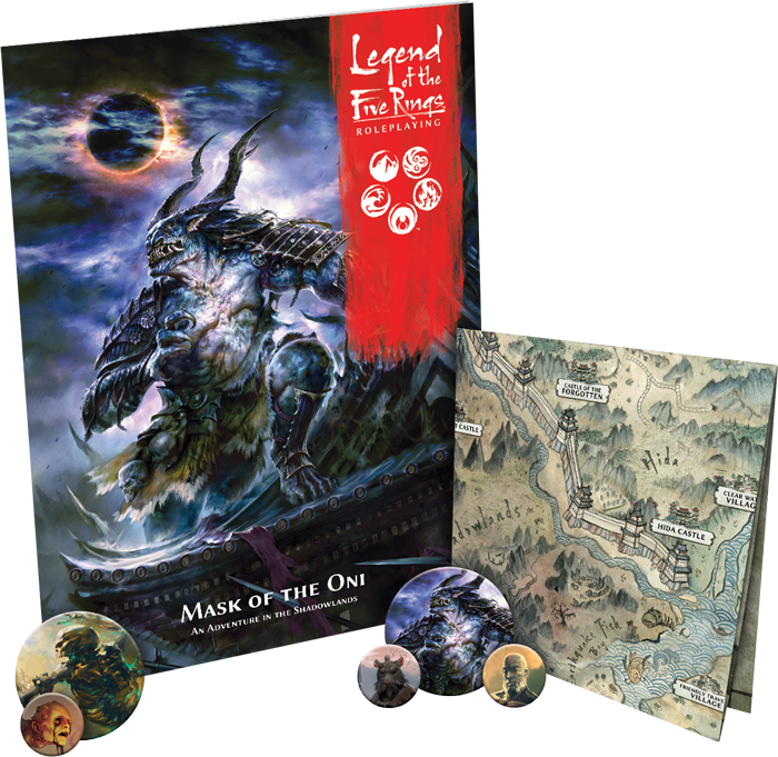 Take your players into the foreboding Shadowlands with Mask of the Oni. This adventure for the Legend of the Five Rings Roleplaying Game pits heroes against the dangers of the Shadowlands and the horrors found within the crumbling walls of the Hiruma family’s fallen castle. Tokens, maps, and an adventure booklet will guide players on their journey, but will they survive with their soul intact?