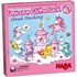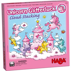 To start, all unicorns stand on the thundercloud. On a turn, a player rolls the blue storm die and either moves 1-3 clouds or stands in place eating a muffin, forgetting all about the race, the crystals, and everything else. If you land on a pink cloud, you roll the crystal die and receive 1-3 crystals; if you land on a present, you give someone else a crystal from the reserve; and if you land on the front end of a rainbow, you slide along the path to the next cloud. Whoever reaches the final cloud first claims the four crystals there, then players compare their holdings to see who horned their way to victory.