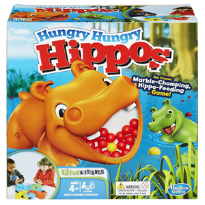 This children's game is as much of a toy as it is a game. Each player has a plastic hippo that is arranged around a plastic arena. When you push the tail it will reach its head onto the playing field - perhaps trapping one or more marbles to be pulled back to a private player marble gutter, perhaps just sending marbles bouncing around the playing field.
