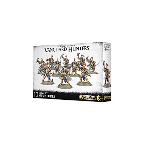 This multi-part plastic kit contains the components necessary to assemble 10 Vanguard-Hunters. They come with a host of details, appropriate to their constant movement and veteran status: 2 shock handaxes and 10 sets of boltstorm magazines to attach to their waists, as well as grappling hooks and satchels. 2 arms featuring reloading boltstorm pistols are included as an optional assembly.