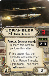 SKU SWXMS12 Availability 2 in stock Scrambler Missiles (X-Wing 1.0) Scrambler Missiles Old price: £20.17 incl tax Price: £1.50 incl tax Qty: Add to cart Email a friend Question about product? Add to wishlist Details ATTACK (TARGET LOCK): Discard this card to perform this attack. If this attack hits, the defender and each other ship at Range 1 receive 1 jam token. Then cancel all results. Points:2