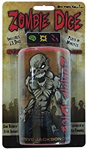 In Zombie Dice, you are a zombie. You want braaains – more brains than any of your zombie buddies. The 13 custom dice are your victims. Push your luck to eat their brains, but stop rolling before the shotgun blasts end your turn! Whoever collects 13 brains first wins. Each game takes 10 to 20 minutes and can be taught in a single round.